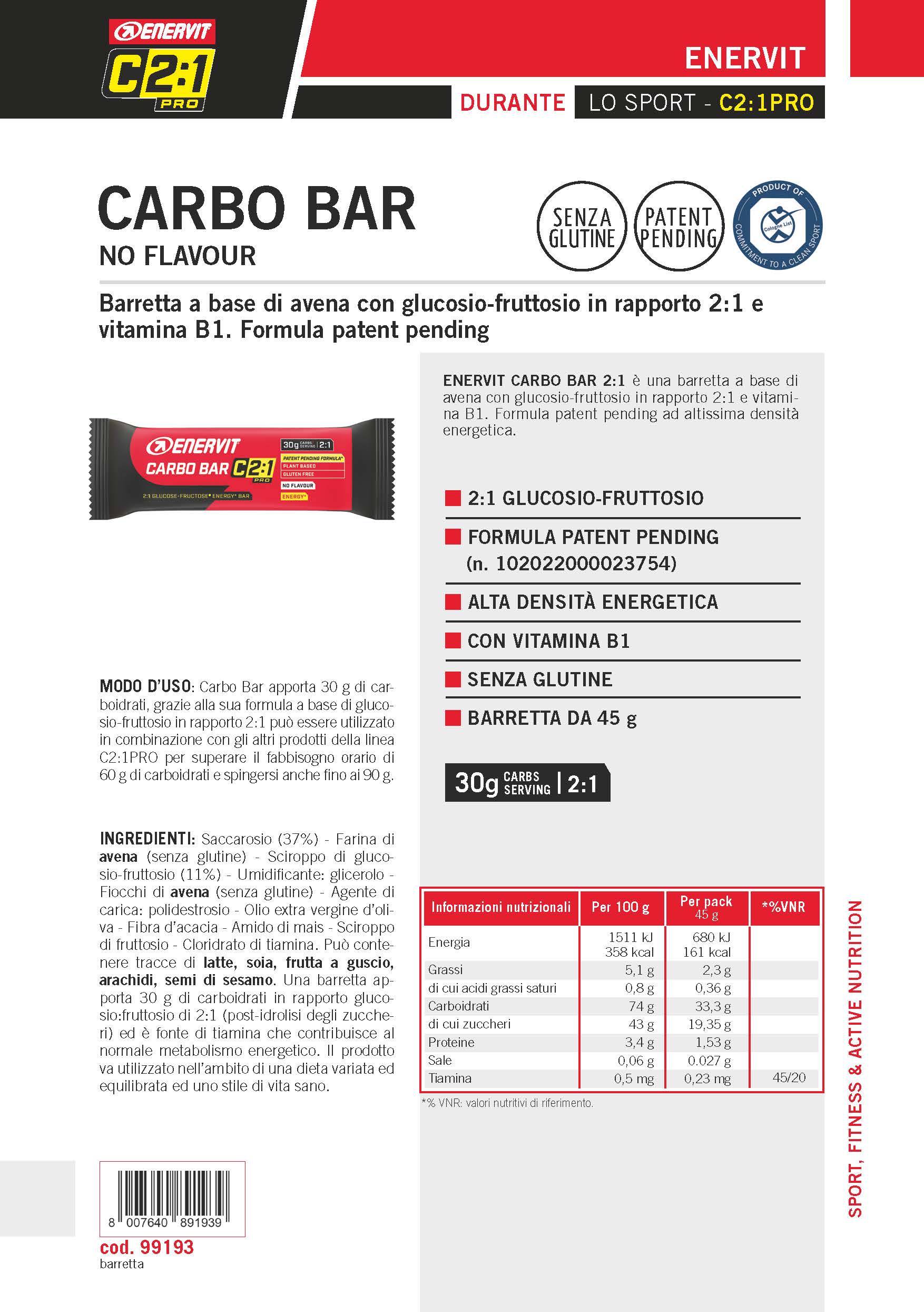 ENERVIT CARBO BAR 2:1 è una barretta gusto brownie a base di avena con glucosio-fruttosio in rapporto 2:1 e vitamina B1. Formula patent pending ad altissima densità energetica. VEGANOK