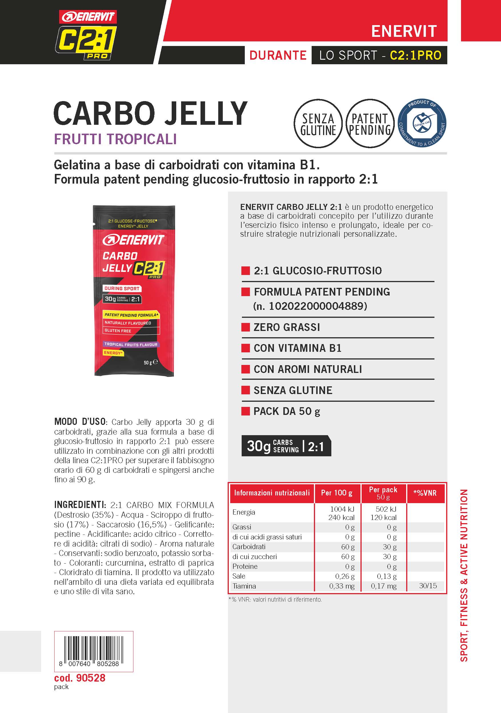 ENERVIT CARBO JELLY 2:1 è un prodotto energetico a base di carboidrati concepito per l’utilizzo durante l’esercizio fisico intenso e prolungato, ideale per costruire strategie nutrizionali personalizzate.