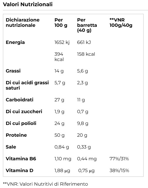 Proteine del latte (33%) - Collagene idrolizzato (20%) - Cioccolato di copertura bianco con edulcorante (edulcorante: maltitoli, burro di cacao, latte intero in polvere, emulsionante: lecitine, aroma naturale di vaniglia) (17%) - Umidificante: glicerolo - Grasso di karitè - Edulcorante: maltitoli - Granella di mandorle - Olio di girasole - Sale - Aroma naturale - Emulsionante: lecitine - Mix vitamine (fibra d’acacia, cloridrato di piridossina, colecalciferolo). Può contenere tracce di altra frutta a guscio, soia, arachidi, semi di sesamo.