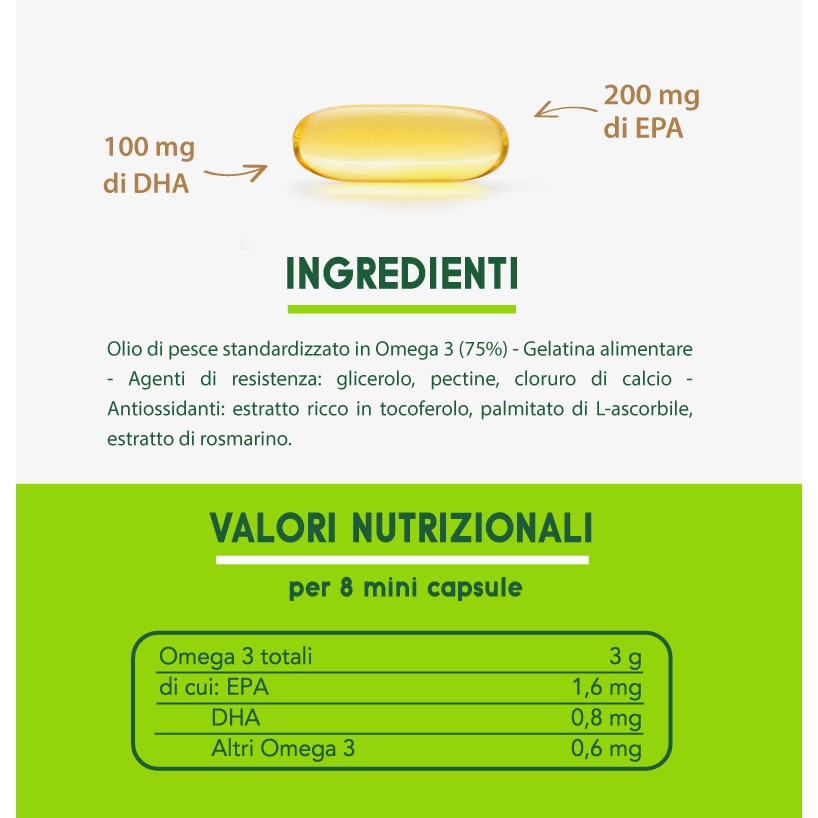 1 capsula contiene: 200mg di EPA, 100mg di DHA e 75mg di Omega 3 aggiuntivi